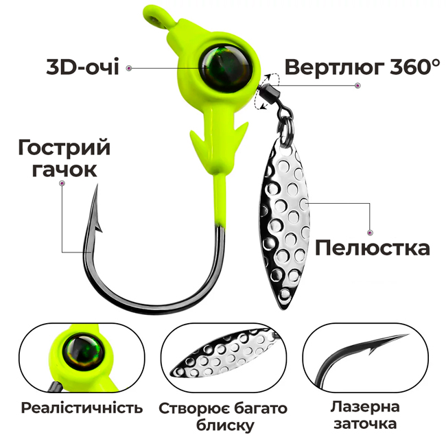 Спеціальний шип-фіксатор на шийці джиг-головки намертво утримує силіконові приманки. Ваш віброхвіст або твістер не буде сповзати під час силових закидів, проходження через траву чи після пустих клювань.