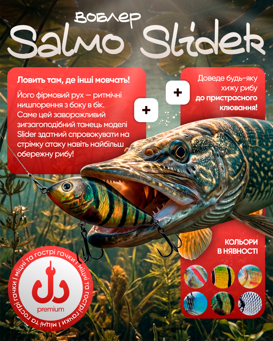Slider доведе будь-яку хижу рибу до пристрасного клювання! Клювання завжди відбувається жадібно, з потужним вибухом агресії. Пінячі бризки води і вереск гальм котушки, це те, що чекає Вас найближчим часом.